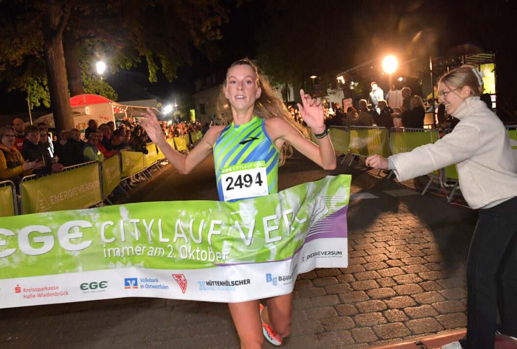 Knapp 2.400 Finisher stellen einmal mehr die Beliebtheit des EGE-Citylaufes heraus. Aber auch in der Spitze wurden neue Bestmarken gesetzt. Über die 10km bei den Frauen konnte Vorjahressiegerin Kiara Nahen (LC Paderborn)ihre überragende Zeit (33:36) nochmals verbessern. Die 6. der Deutschen Meisterschaften über 5.000m lief nach 33:14 nochmals 22 Sekunden schneller und setzte damit ein riesiges Ausrufezeichen und einen neuen, fabelhaften Streckenrekord! Auch beim Männerrennen gab es einen neuen Streckenrekord. Genau wie Kiara Nahen trat Vorjahressieger und frischgebackener Deutscher U23 Meister Lars Franken (LG Olympia Dortmund) erneut an und verbesserte seine Zeit um 20 Sekunden auf 30:33. So schnell war noch niemand in 12 Jahren Verler Citylauf! Echte Gegner hatte er auf der Strecke keine. Seine persönliche Challenge lag in der Anreise denn er steckte, wie viele andere auch, im Superstau auf der A2. Eben dieser Superstau machte die Streckensperrung in der Verler Innenstadt zur Mammutaufgabe denn die Autobahnbedarfsumleitung führt genau durch Verl. Hermannslaufsiegerin Ann-Christin Opitz bezeichnete die Stimmung entlang der Strecke als gigantisch und ließ sich von ihr auf Platz zwei tragen. Der Kampf um Silber bei den Männern war ein internes Duell des LC Paderborn. Tom Bens (32:00) hatte die Nase leicht vor Julian Borgelt (32:13). Neben den knapp 300 Läufern über 10km machten über 800 Schulkinder, mehr als 400 Kindergartenkinder, 400 Firmen, 400 Einzelläufer und 20 Walker die 12. Auflage zur perfekten Mischung aus Spitzen- und Breitensport. Ein dickes Dankeschön an die über 100 Helfer und alle Teilnehmer. Wir sehen uns am 2.10.2026!